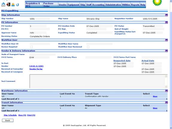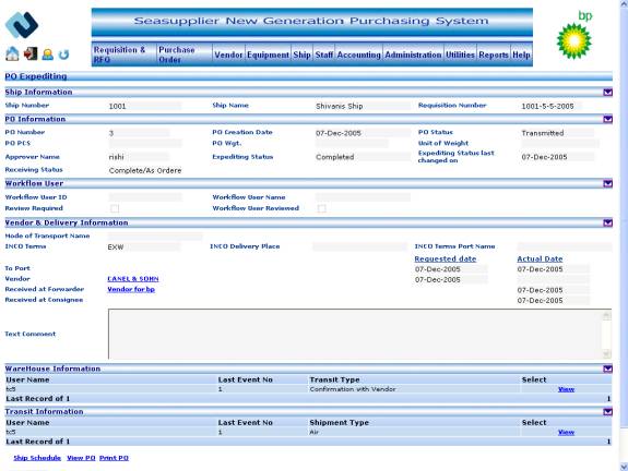 On click of the Back button, the user is taken back to the Expediting Status Display – Search screen. On the other hand, clicking the View button takes the user to the PO Expediting View screen, which is available in read-only mode.