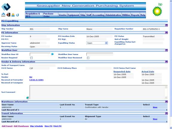 Select the relevant POs from the information grid and click the Edit button . On the PO Expediting page click the Add Transit link button.