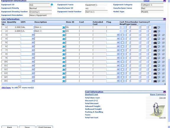 Click the Clear link to clear all the text box values in the equipment information section. You can then re-enter new equipment information in this section. Clear button is available only for manual entry items.