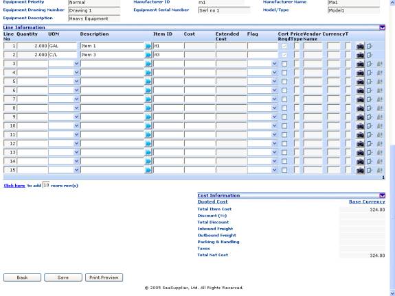 This indicates the total cost calculated on the basis of information provided in the above fields in this section. It is the sum total of Total Item Cost, Inbound Freight, Outbound Freight, Packing/Handling, Taxes minus the Total Discount. The value of this field is updated based on the addition of new line items.