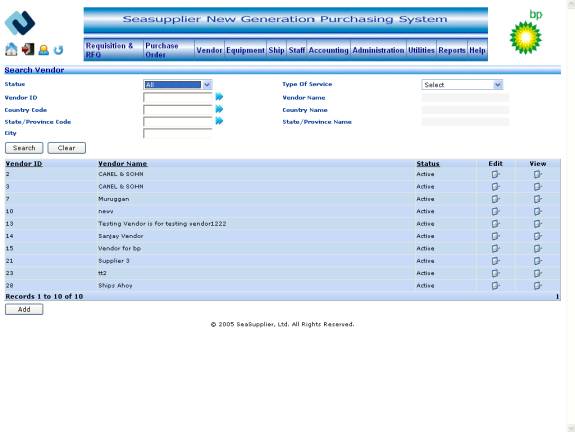 The Search Vendor screen allows the user to search for vendors and vendor related information in the SeaSupplier system.